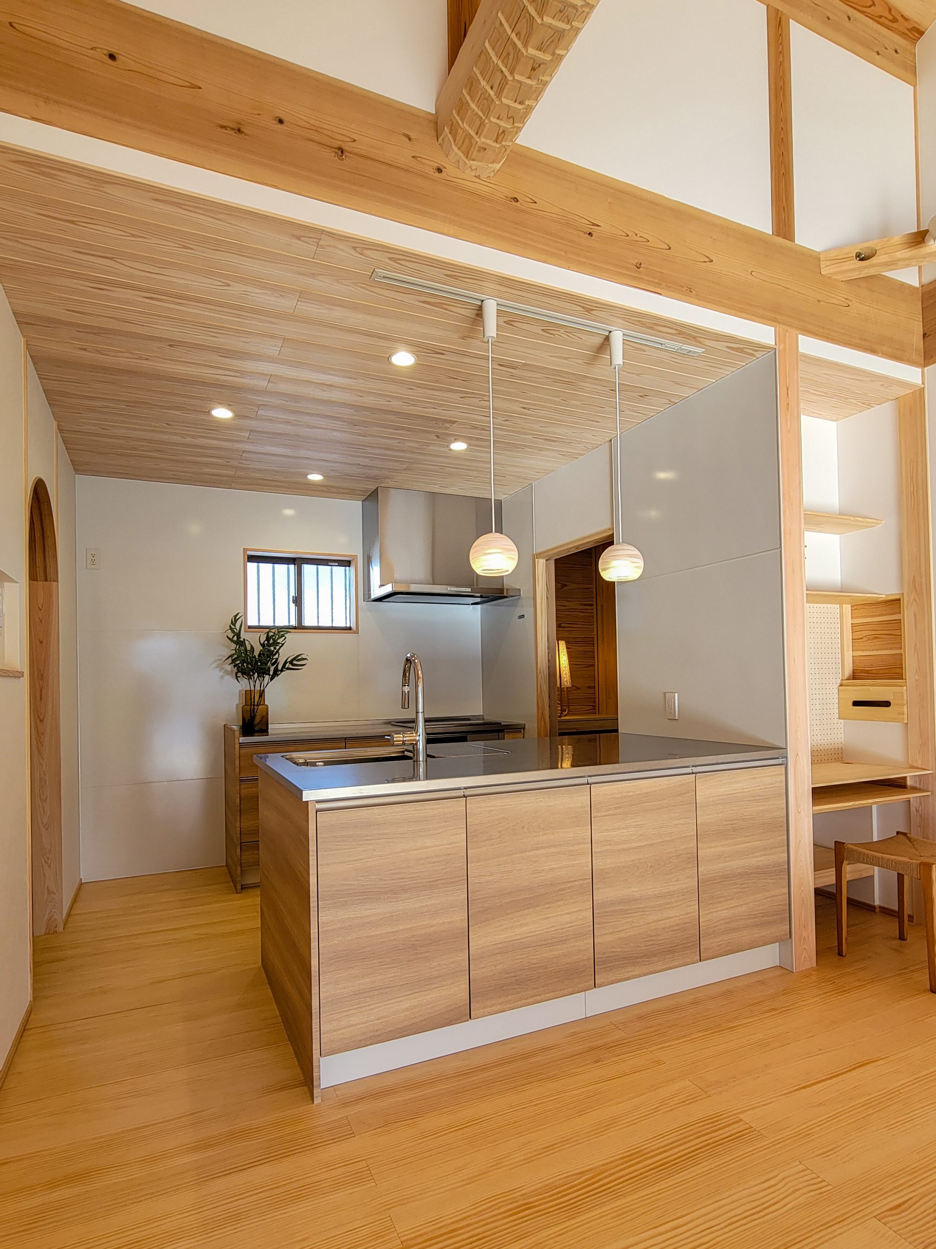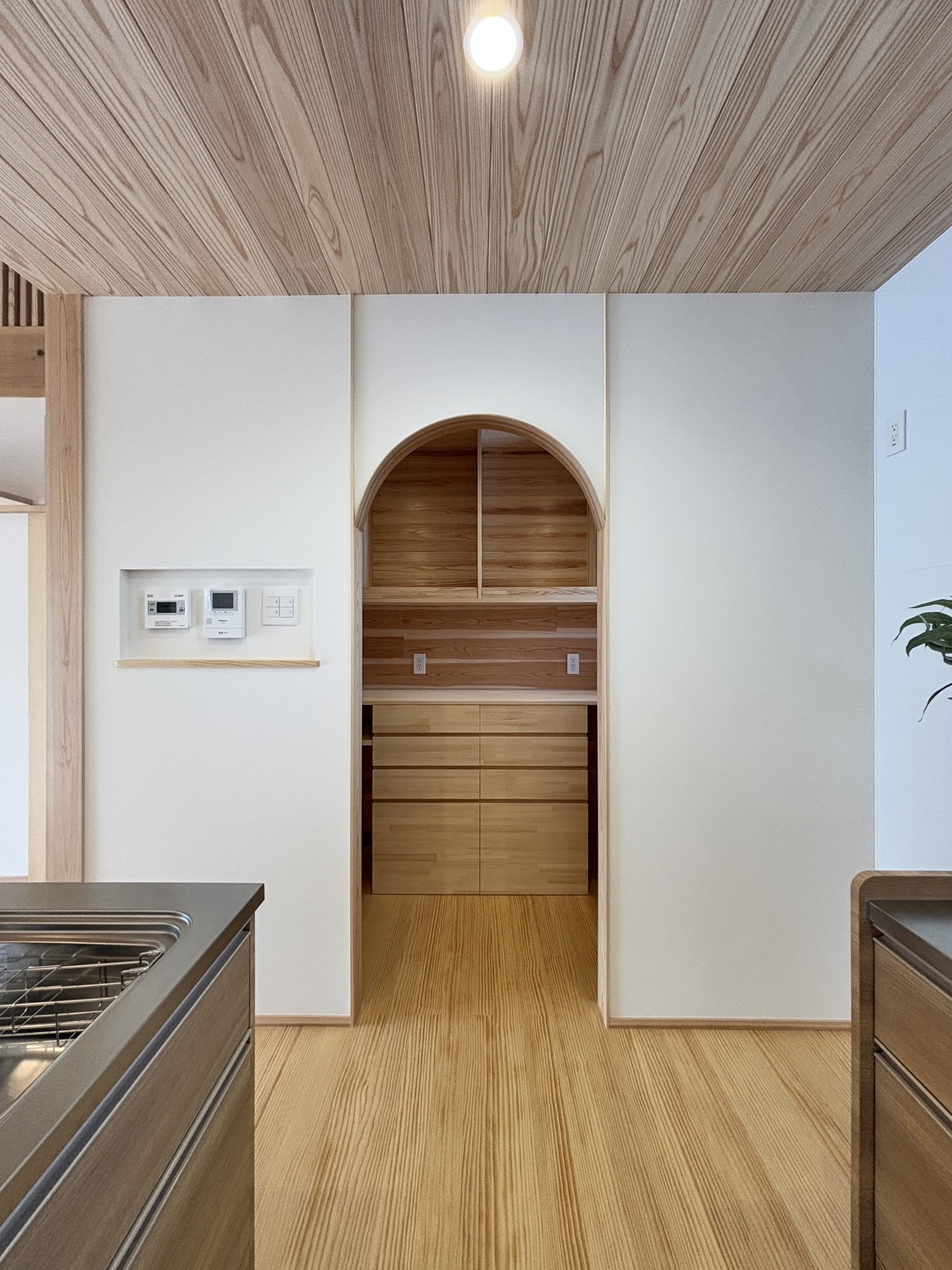 Ⅱ型キッチン+パントリーに家電も収納が出来るので、リビングから見ても生活感が出ないのがこのお家ならではのポイント!