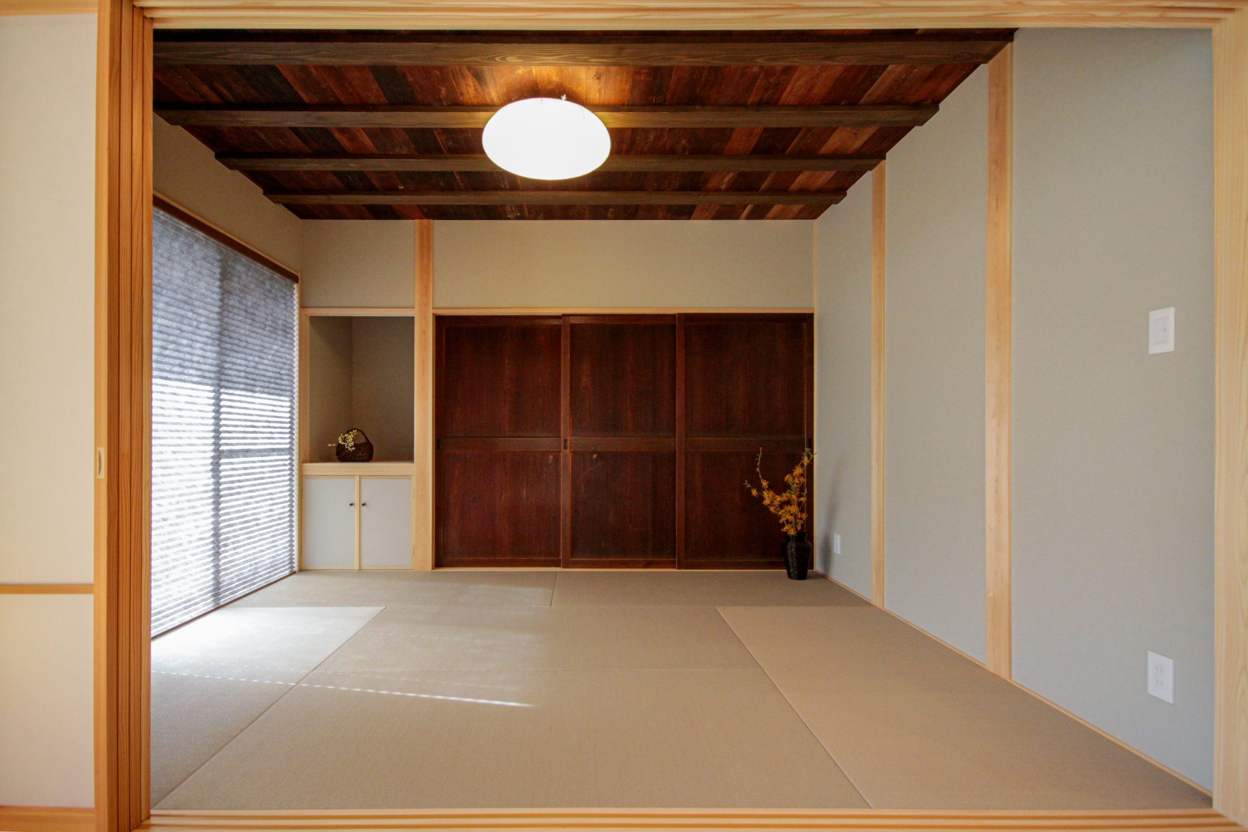 和室の天井は解体した建物で利用していた材料を棟梁に加工してもらい古民家風の和室にしてもらいました。