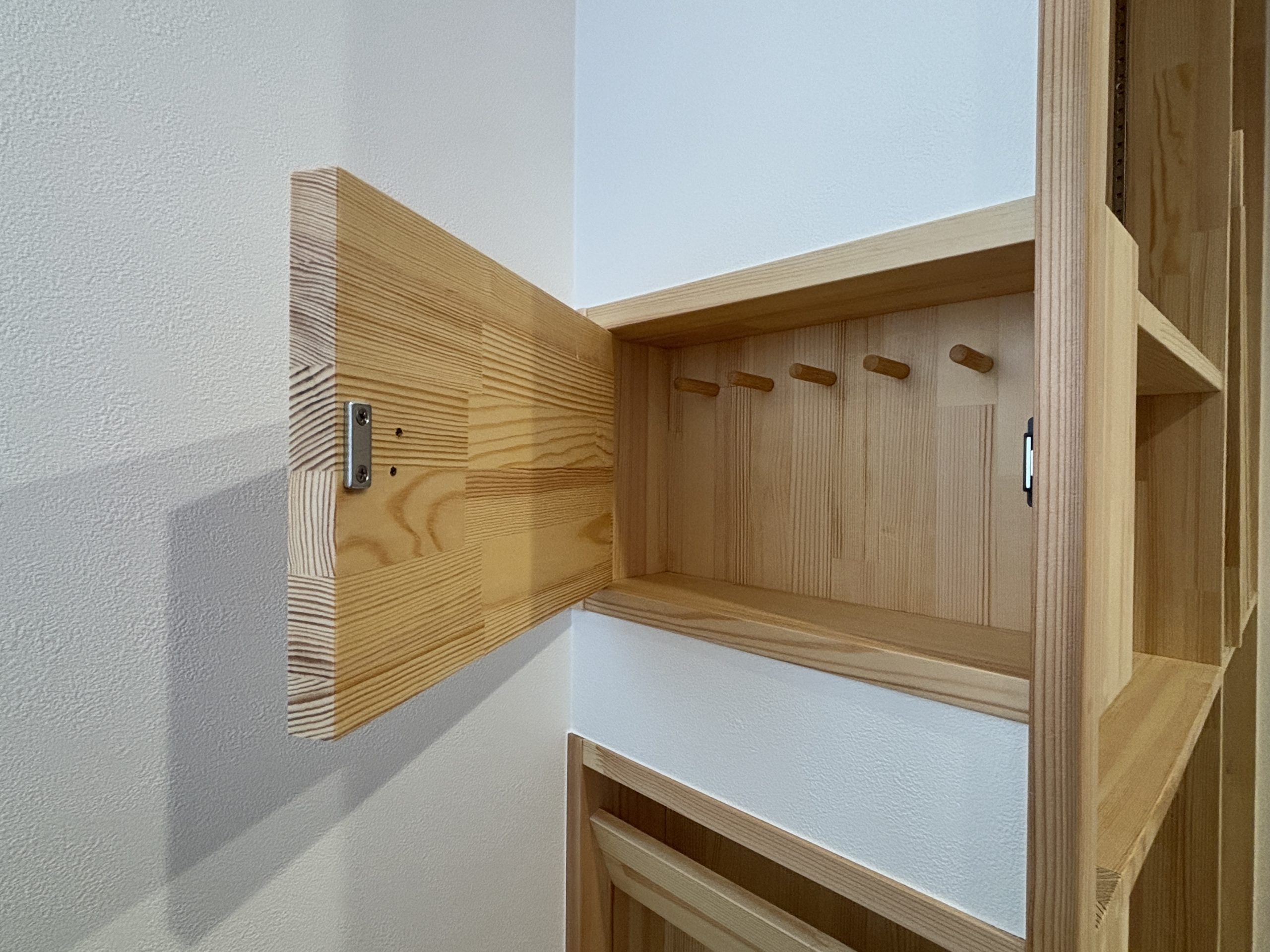 玄関にカギ掛けが欲しいとの事でしたので、玄関収納を少し加工して鍵掛けスペースを作りました。