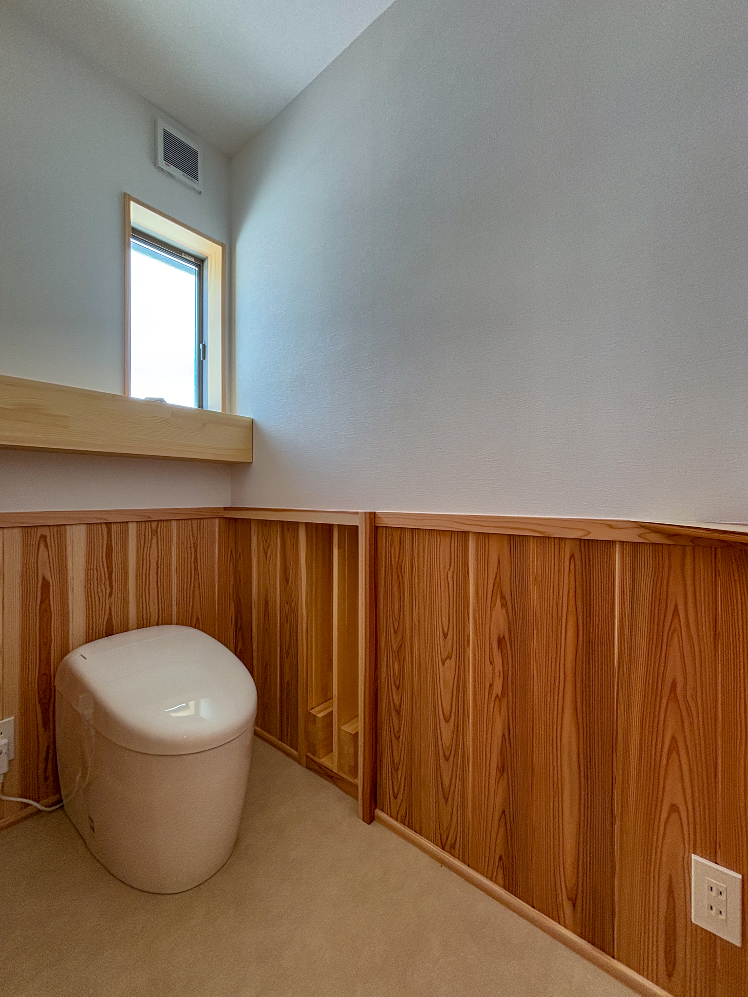 建前後のお打ち合せでトイレに収納が欲しいというご要望をいただきましたので、トイレの腰下収納は現場で打合せをして新しく作りました。