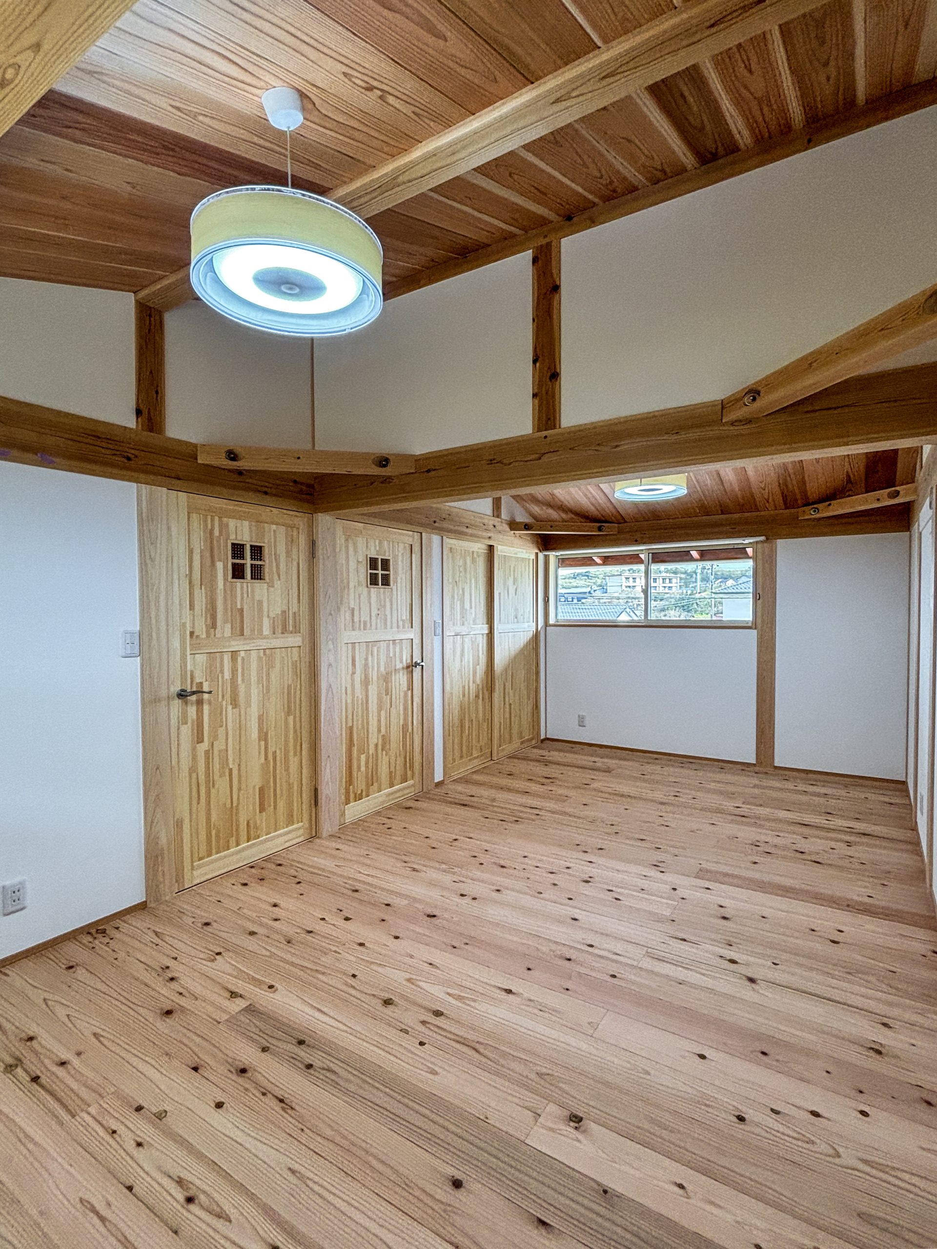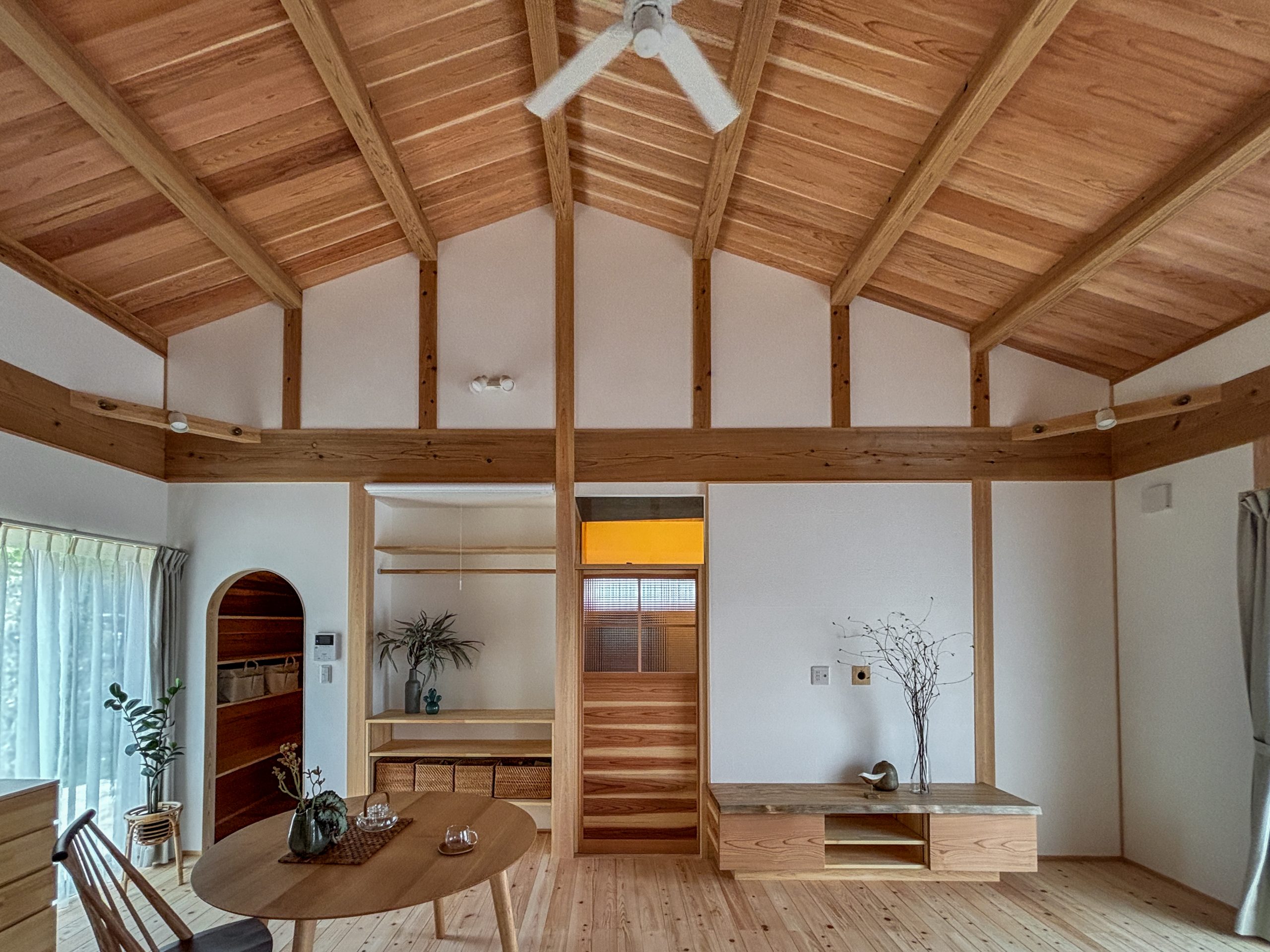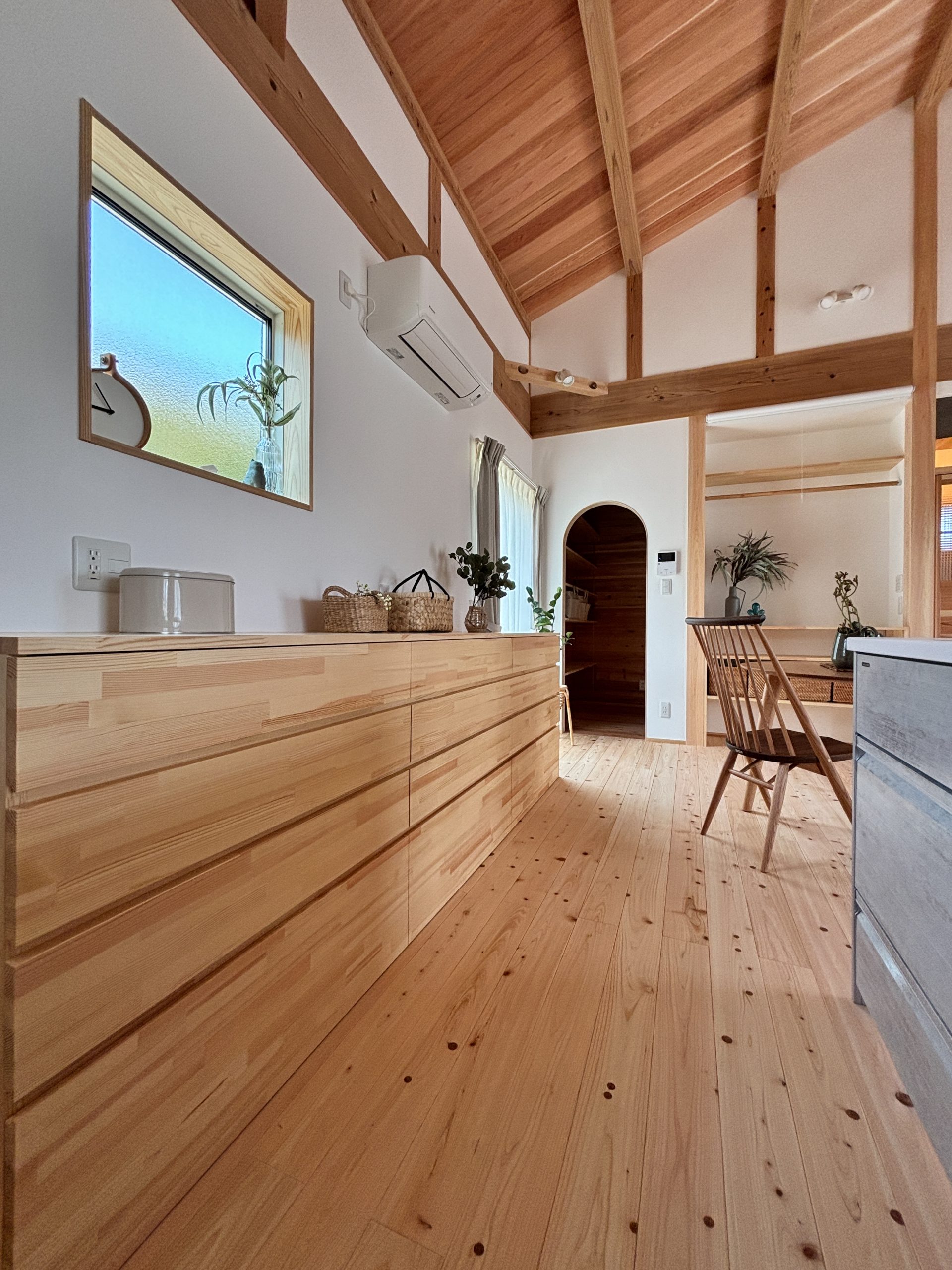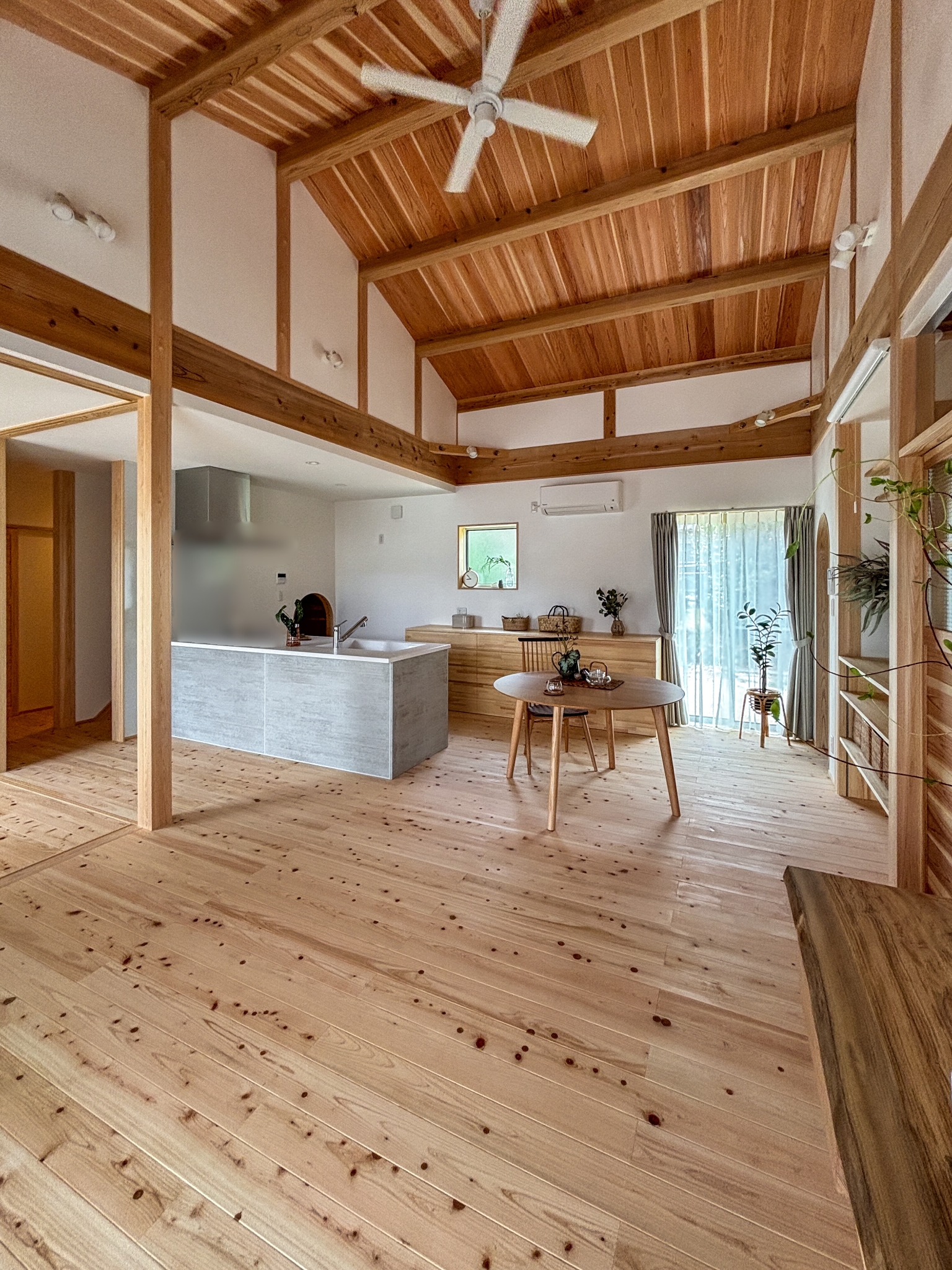 天井に広がる木目は視線を自然に導き、空間をよりのびやかに感じさせてくれます。岐阜県産材・自然素材にこだわったお家です。