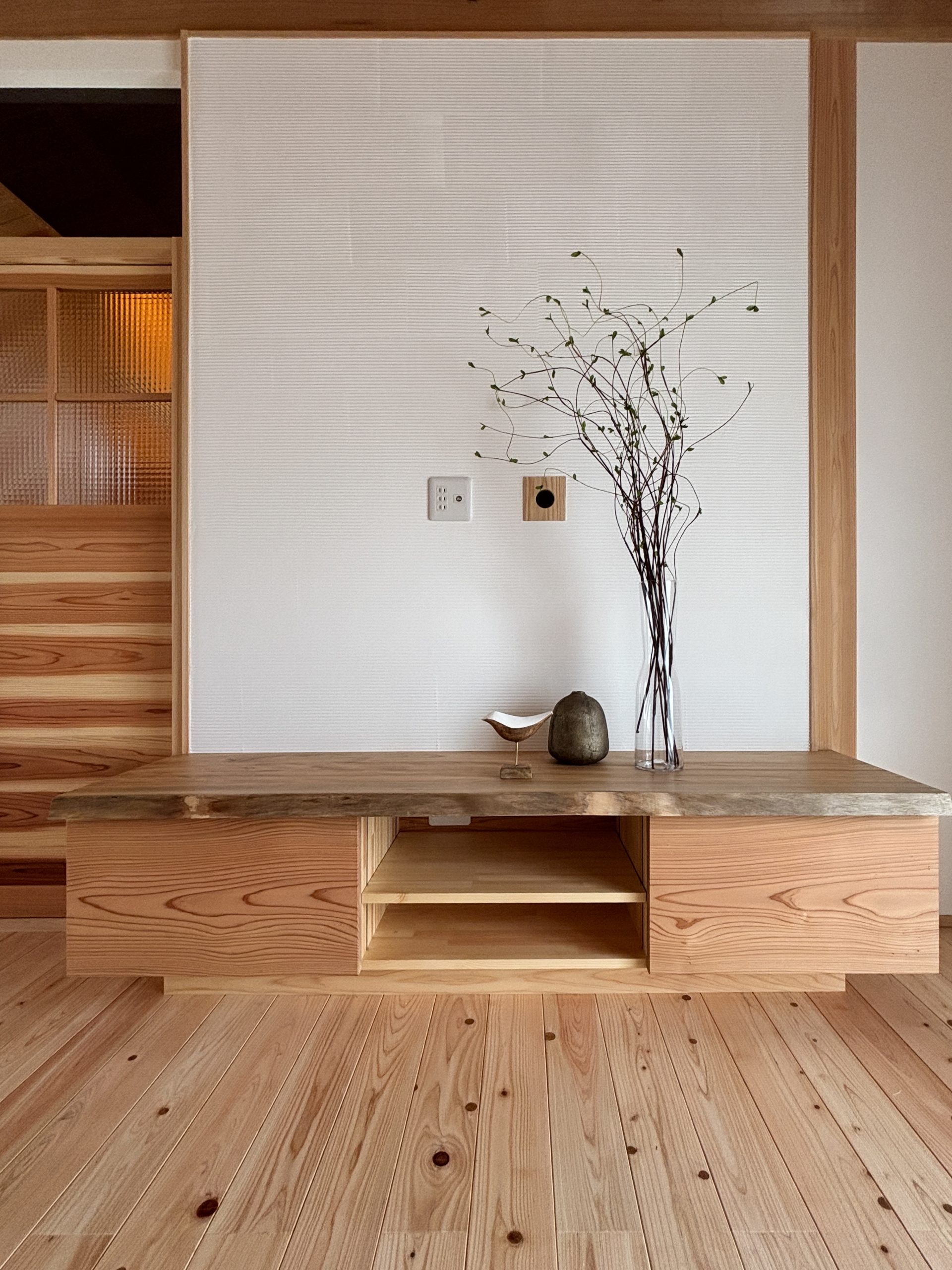LDKの床はヒノキ、床は杉板、TVボードなどの造作家具も無垢の一枚板を使用するなど、木に囲まれた空間となりました。