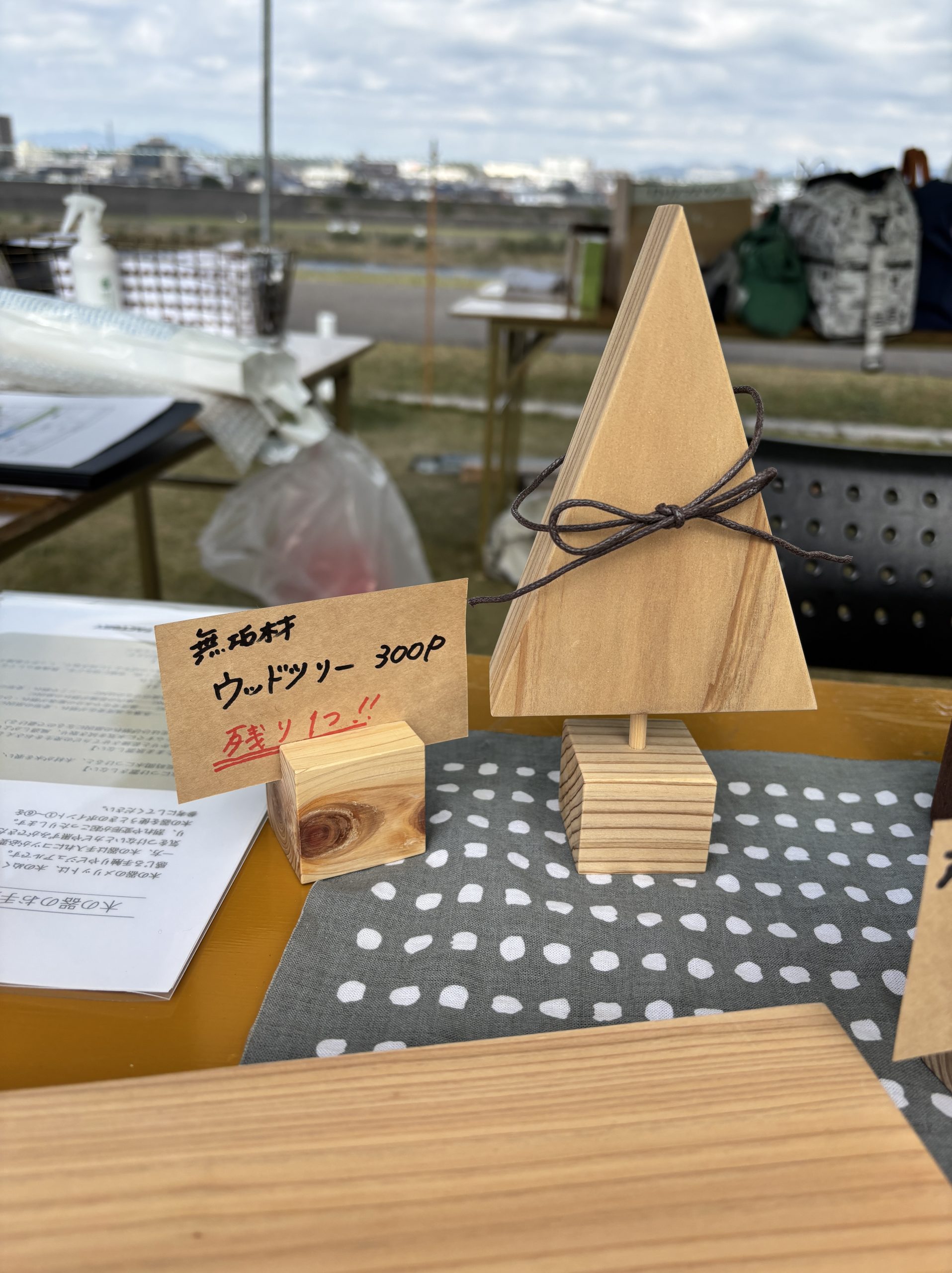 弘栄マルシェでは、木で作った小物や弘栄オリジナルの手ぬぐいなどを販売。