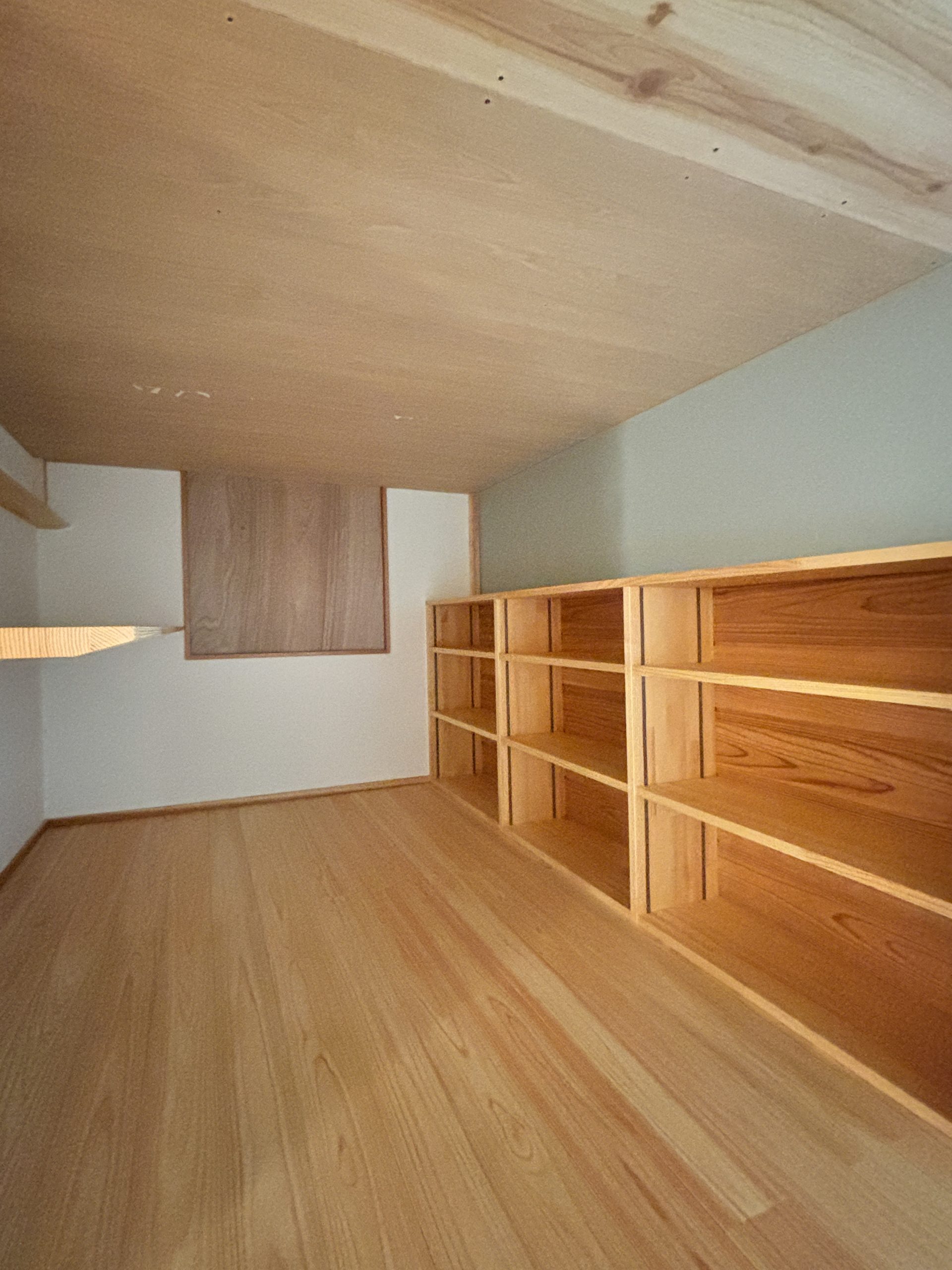 床は長野で切り出された木材のあづみの松の床材。壁は漆喰塗り、天井は岐阜県産材の杉板張りになっています。明るい色の木材を使うことで、自然光が室内に優しく広がり明るい印象になります!