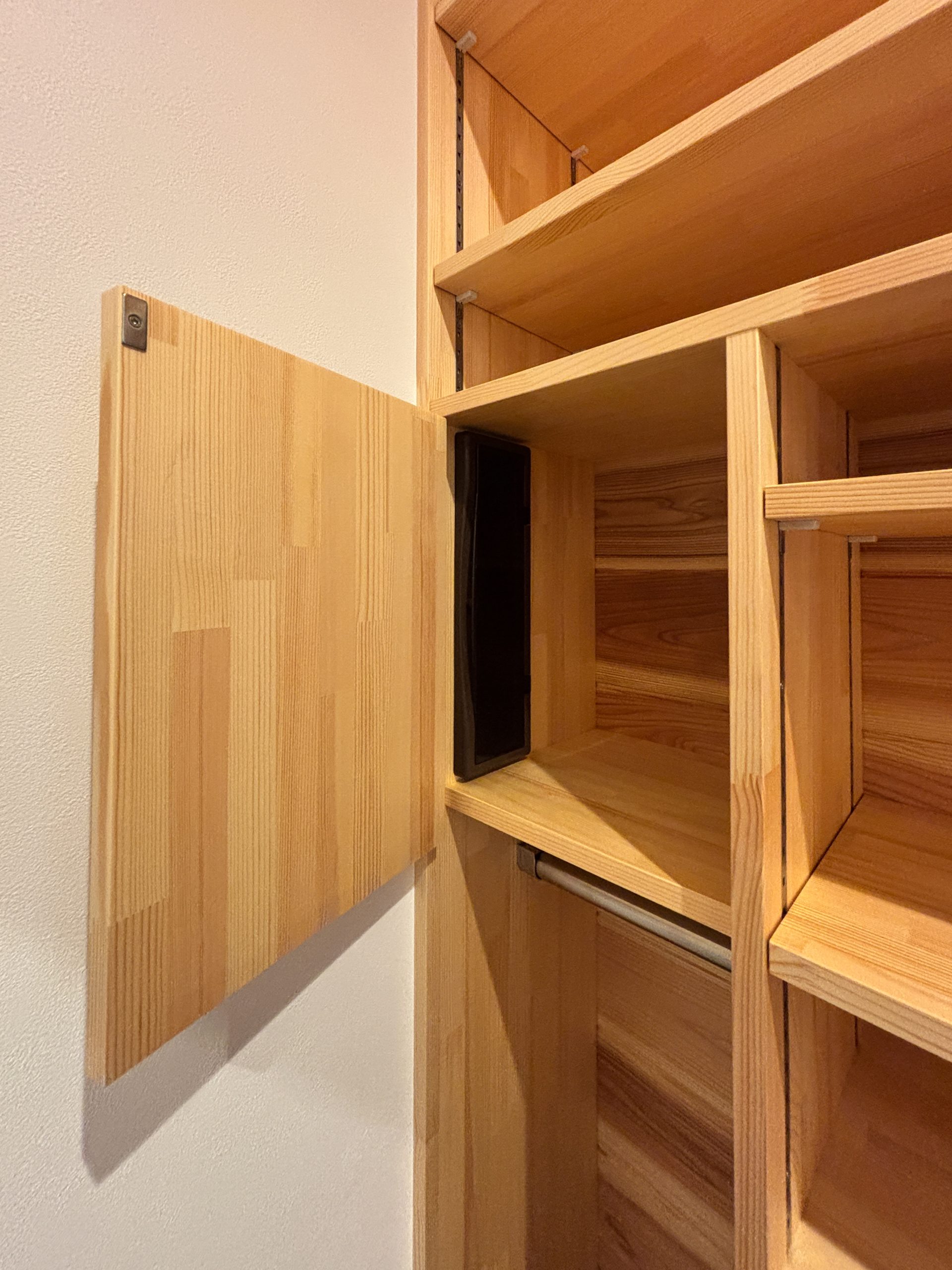 立派で存在感は感じつつも、オープンなので圧迫感がなく自然と空間に馴染みます。配線が隠せるように、通せる穴も計算して作っています✨