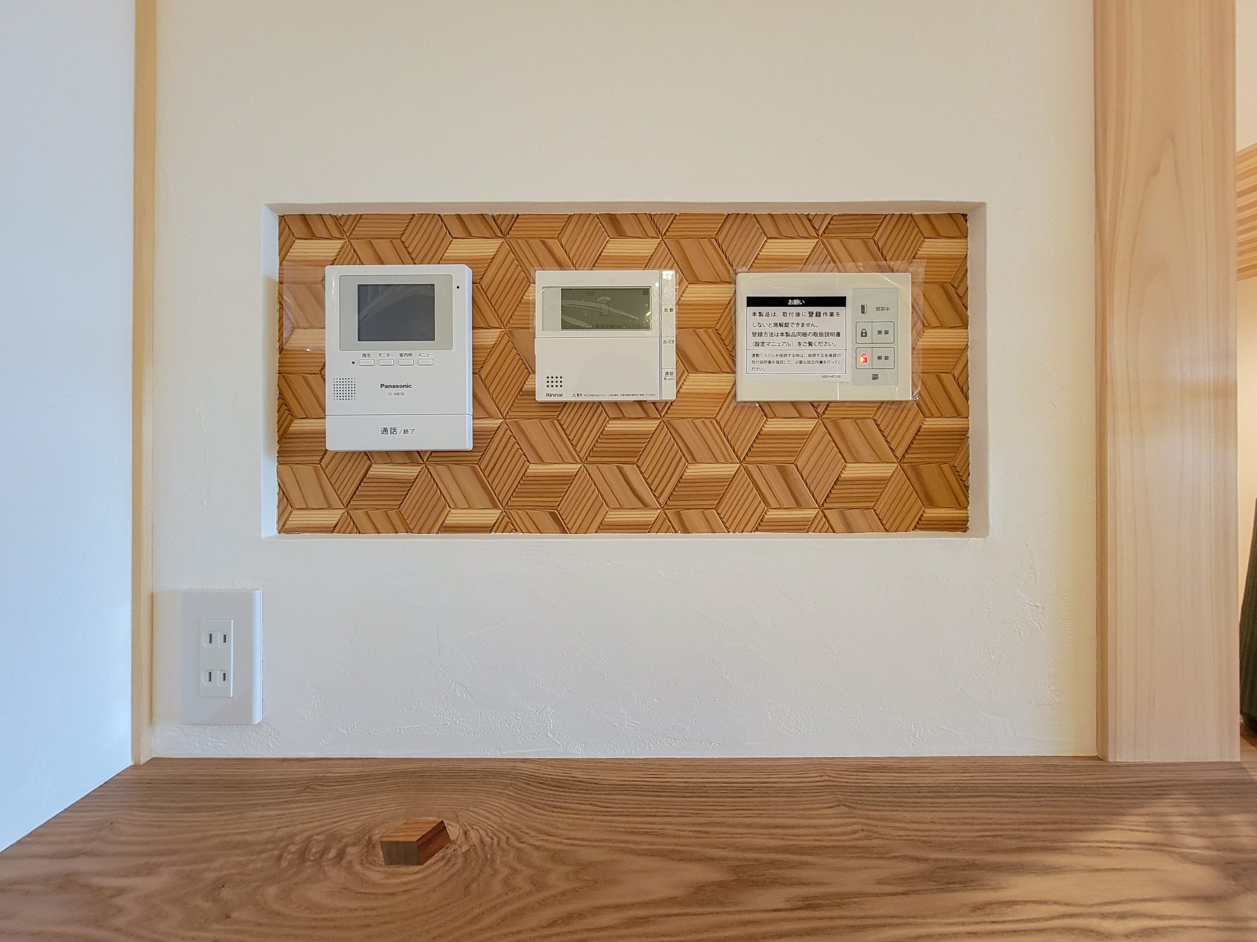 棟梁が一つ一つ手作業で収めた組子細工のスイッチニッチ。