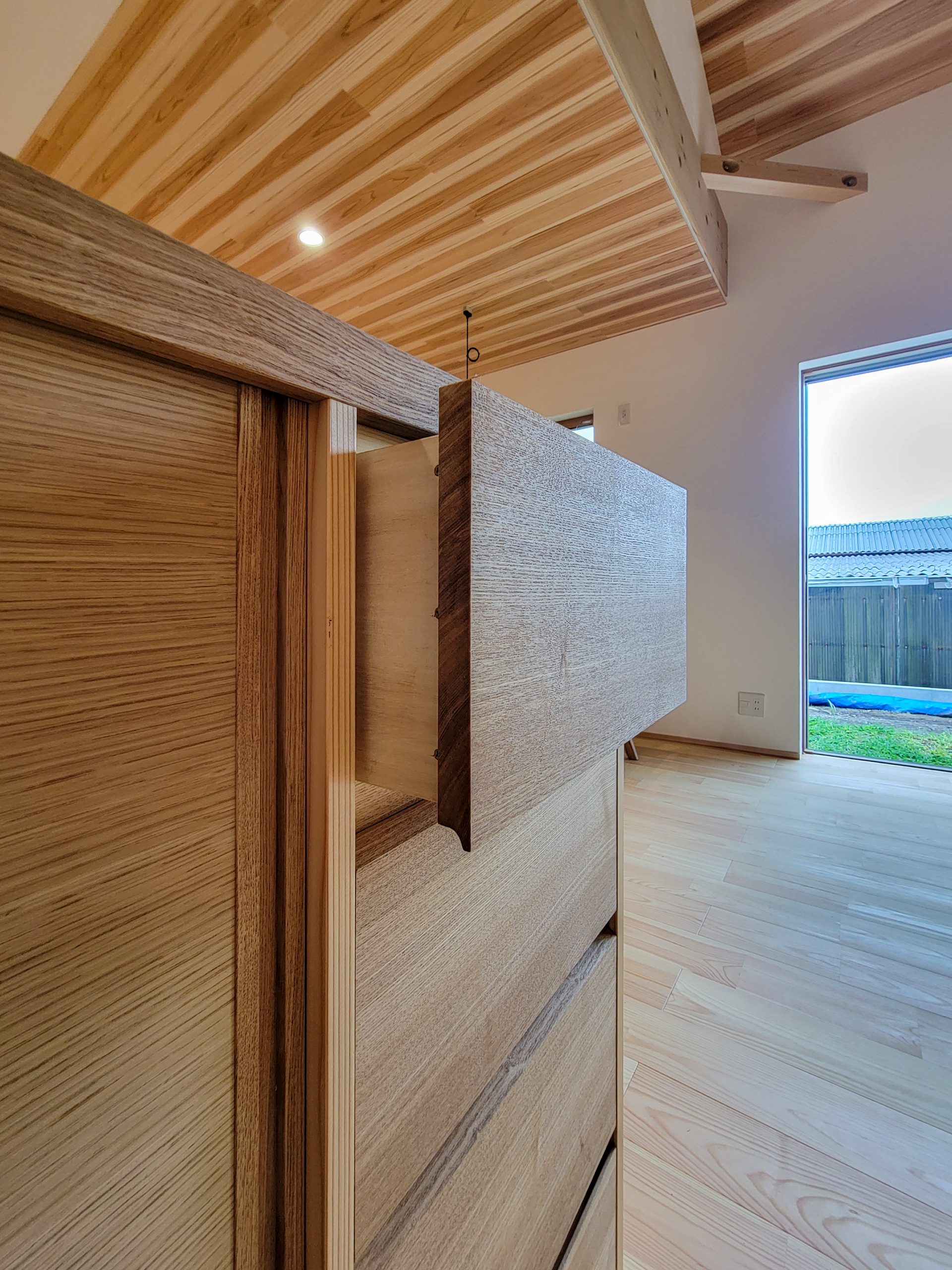 タモの一枚板から加工された引出しとなっています。細やかな木目が美しいデザインです。
