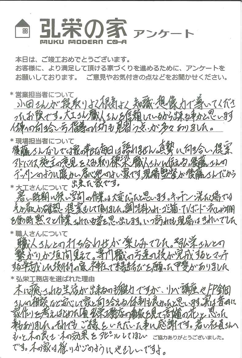 最初から最後までいつでも連絡が取れやすく、物事がサクサク進み、とても楽しい家づくりを経験することができました。プライベートのお話でも盛り上がる事が多く、とても楽しかったです。
